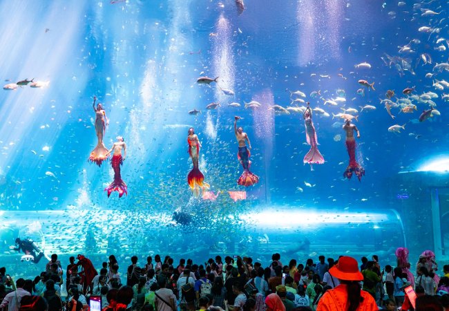 Một hoạt động mà bạn nhất định phải tham gia sau khi dùng bữa chính là show diễn Sắc màu Đại Dương được tổ chức hàng ngày. Show diễn diễn ra vào hai khung giờ cố định là 14:00 – 14:20 và 15:30 – 15:50, mang đến những màn trình diễn nghệ thuật dưới nước đầy ấn tượng. Những vũ công chuyên nghiệp trong trang phục nàng tiên cá sẽ kể cho bạn nghe những câu chuyện huyền thoại của biển cả ngay sau lớp kính khổng lồ của nhà hàng.
