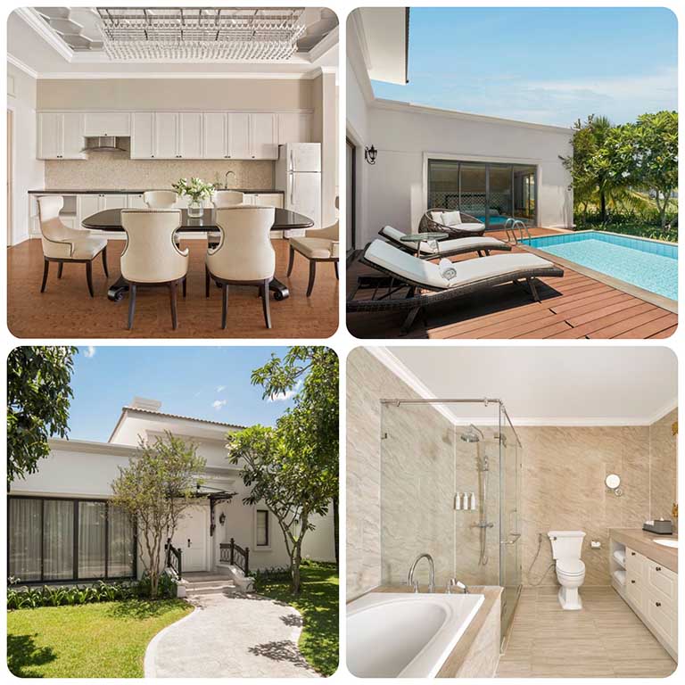 Biệt thự 3 phòng ngủ hồ bơi riêng hướng hướng biển: Diện tích khoảng 460 m2. Có 3 phòng ngủ với 2 phòng ngủ 1 giường đôi và 1 phòng ngủ 2 giường đơn. Phòng tắm đứng, không thể kê thêm giường phụ. Phòng dành cho 6 người.