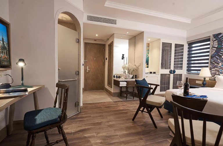 Với tầm nhìn hướng biển Mỹ Khê, bạn sẽ được tận hưởng không khí trong lành và vẻ đẹp của đại dương ngay từ căn phòng của mình. Bên trong, căn phòng được trang bị đầy đủ tiện nghi, với bồn tắm nằm và buồng tắm đứng, mang lại cảm giác thư thái như tại spa. Không gian ấm cúng, nội thất tinh tế cùng sự yên tĩnh sẽ giúp bạn hoàn toàn thư giãn và tận hưởng một kỳ nghỉ đúng nghĩa.