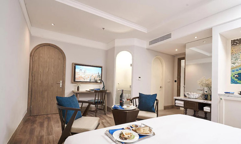 Căn phòng được tạo ra để mang đến sự thư giãn tuyệt đối với thiết kế tinh tế và tiện nghi vượt trội. Điểm nổi bật của suite là bồn tắm nằm sang trọng và buồng tắm đứng riêng, cho phép bạn tận hưởng trọn vẹn từng phút giây thư thái. Nội thất gỗ ấm áp và không gian sinh hoạt riêng biệt sẽ giúp bạn luôn cảm thấy thoải mái như ở nhà. Từ căn phòng này, bạn có thể ngắm nhìn toàn cảnh thành phố hoặc biển, cảm nhận vẻ đẹp của Đà Nẵng một cách thật riêng tư và lãng mạn.