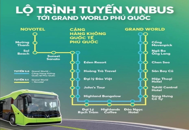 Tuyến xe nội khu đóng vai trò huyết mạch trong việc kết nối các “siêu quần thể” giải trí tại Bắc đảo. Nếu bạn đang ở tại Grand World và muốn sang VinWonders hay Safari, đây chính là giải pháp di chuyển nhanh chóng nhất.